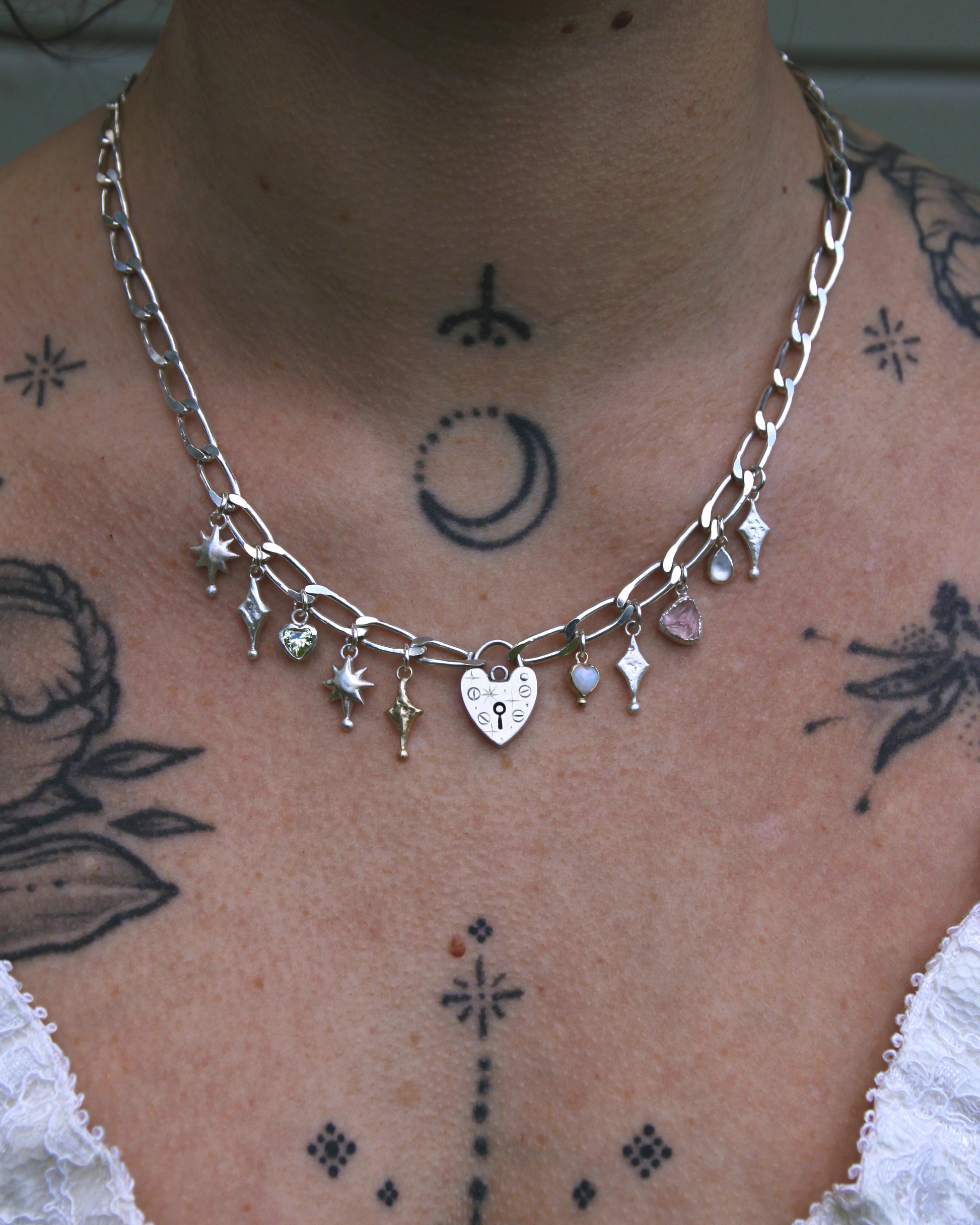 Surrounding the middle heart are a mini trail of molten stars in silver and 9ct gold, smooth stones, faceted, and raw stones. All collected for their unique beauty over time and presented on a chunky 18"curb chain, as an ode to the old charm bracelets. All the stars are hand forged, meaning no two have the same molten surface.