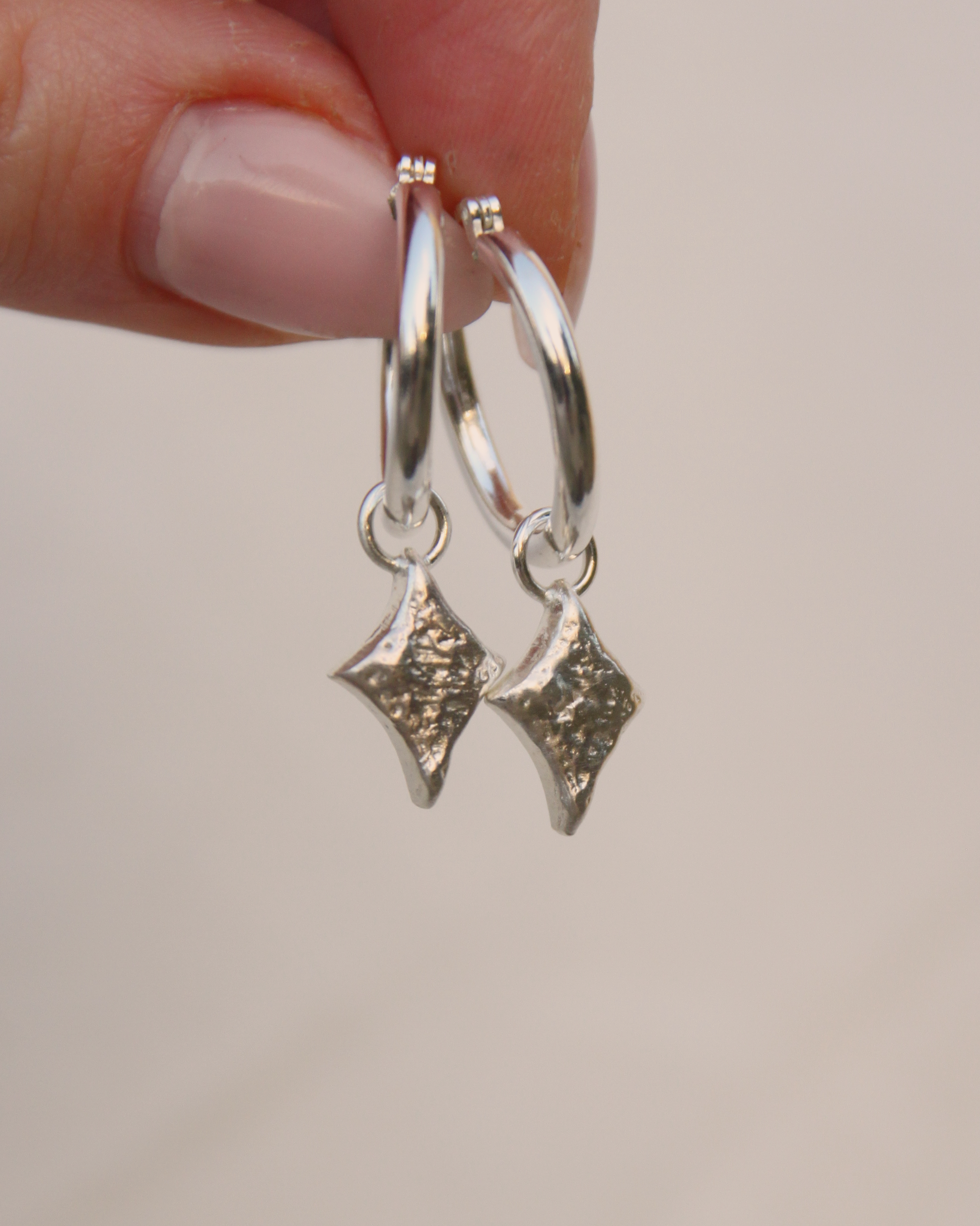 Diamond star hoops ~ molten chunky star charms on a polished hoop, hook and clasps.