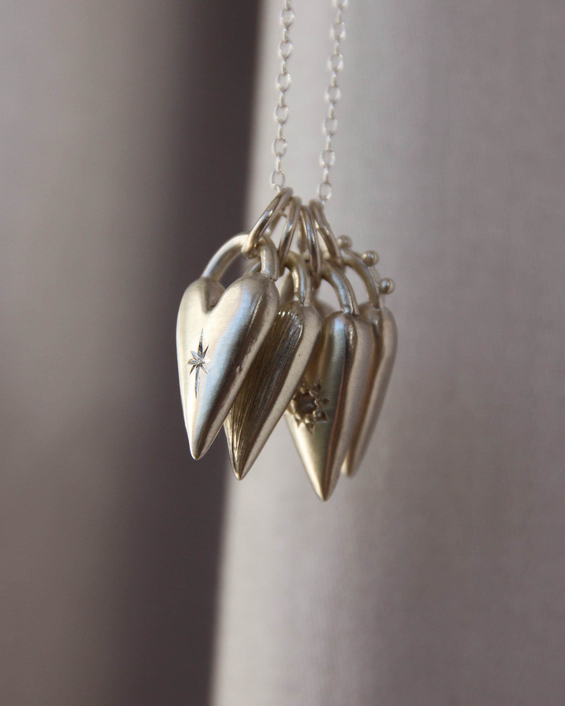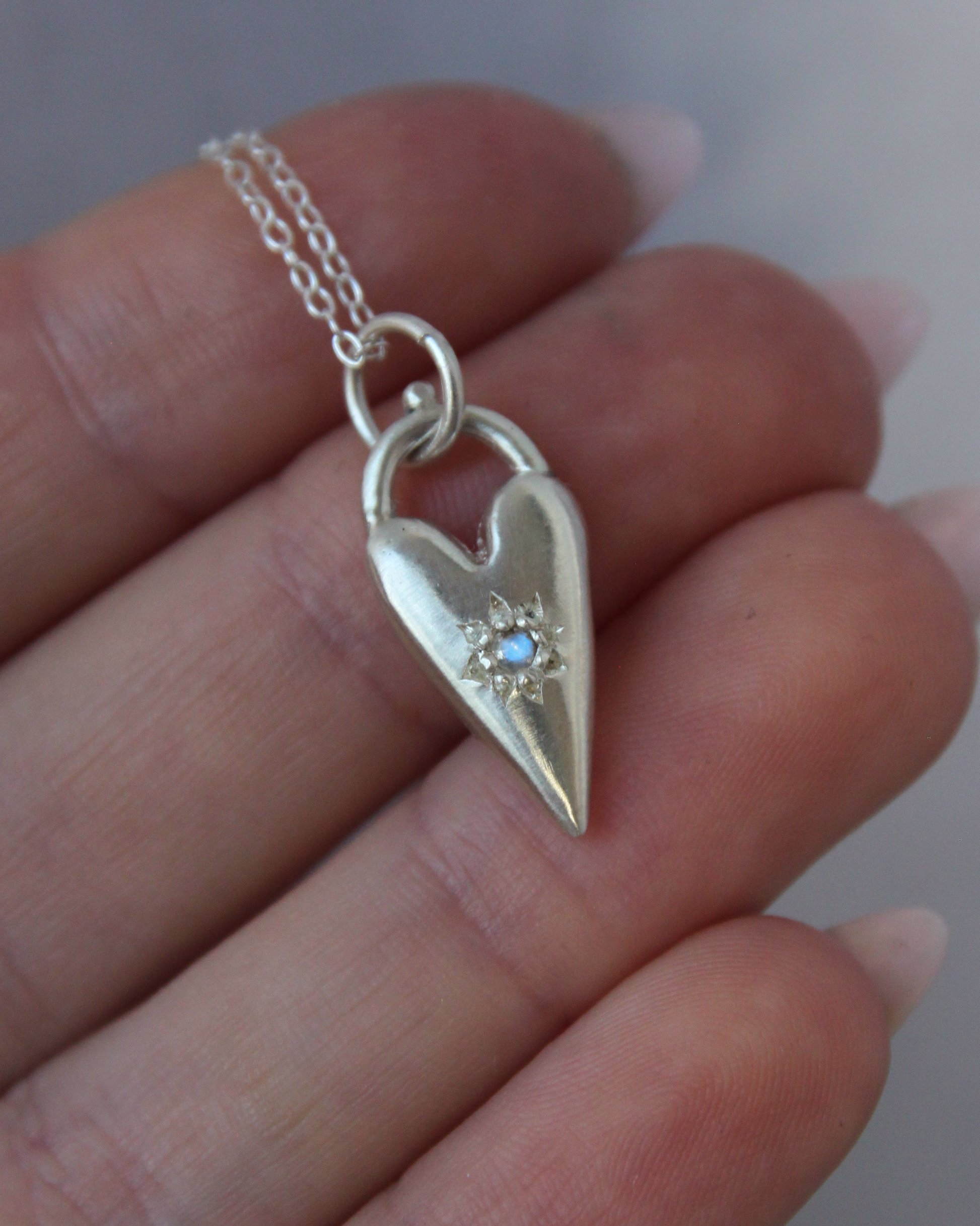 Heart charm ~ Moonstone set in solid sterling silver, with a single bead. These charms have a little weighty feel, and a satin finish.